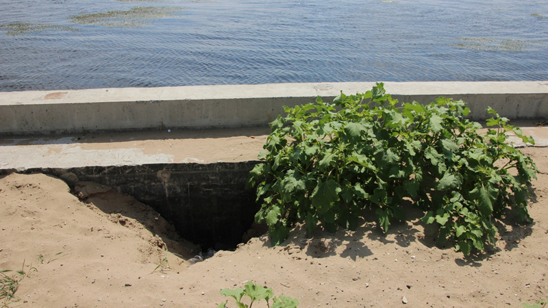 Сейчас островок песка покрылся зеленой травой, подобно оазису среди бетонных плит. Частично насыпь просела, поскольку внизу ее подмывает вода. Там образовалась дыра около метра в глубину. Жители шутят, что это новый пляж для горожан в черте города.