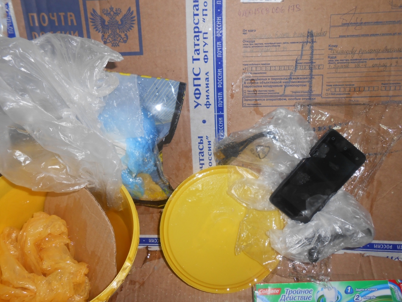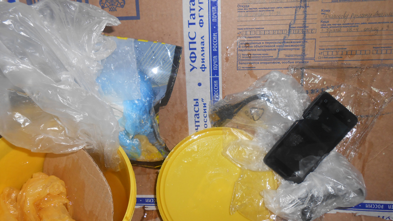 При проведении досмотра посылки, полученной из Казани, в ней был обнаружен пластмассовое ведерко с медом. В нем сотрудники ИК нашли мобильный телефон, USB-шнур и гарнитуру.