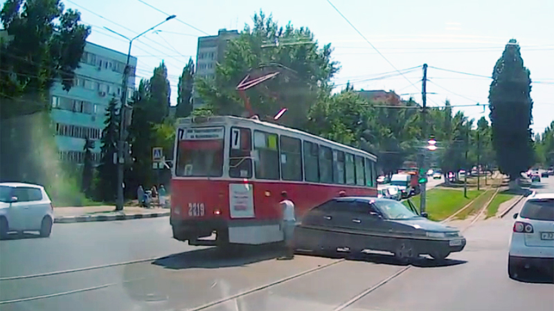 Сегодня днем в Заводском районе Саратова произошло столкновение трамвая и легковушки. Данное происшествие попало в объектив видеорегистратора, установленного в автомобиле очевидца. Видео обнародовали в группе «Заводской онлайн» соцсети «ВКонтакте».