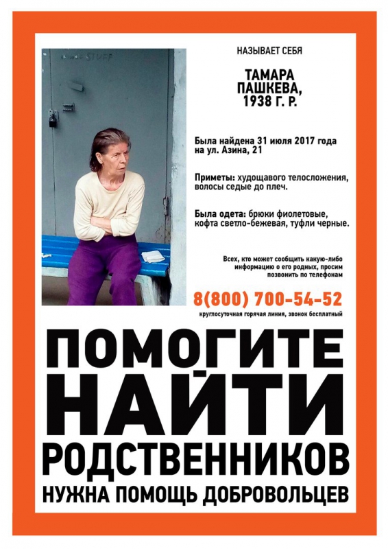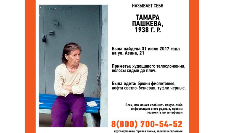 Всех, кто может сообщить какую-либо информацию о родных пенсионерки, просят звонить по телефону 8 800 700 54 52.