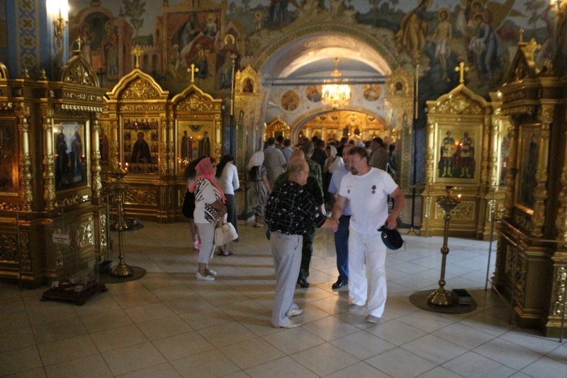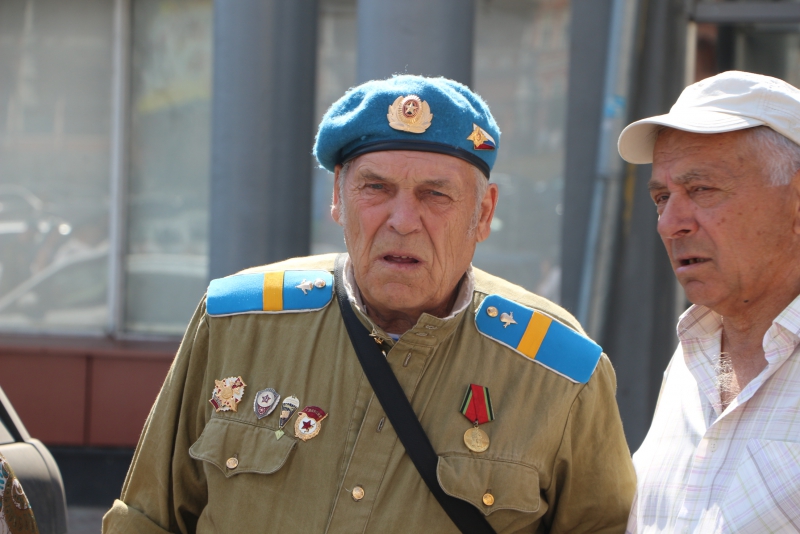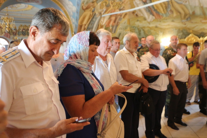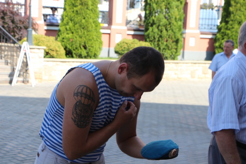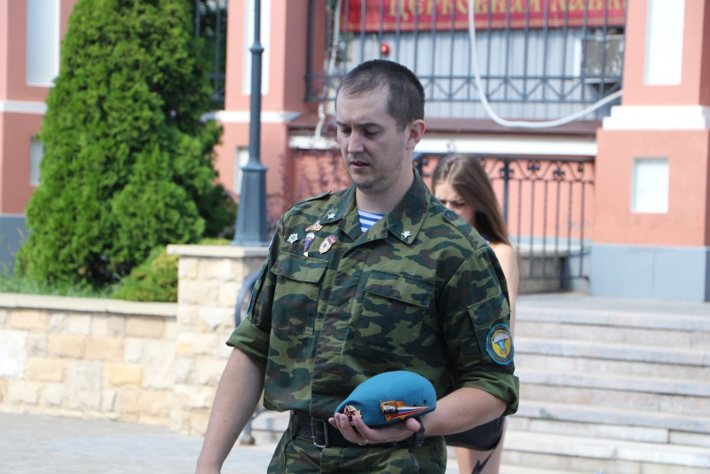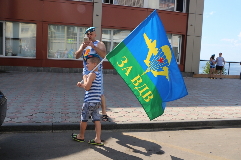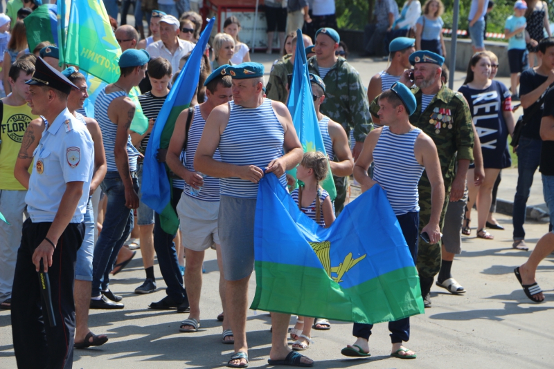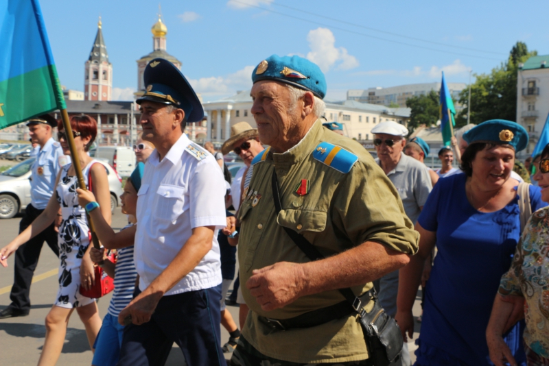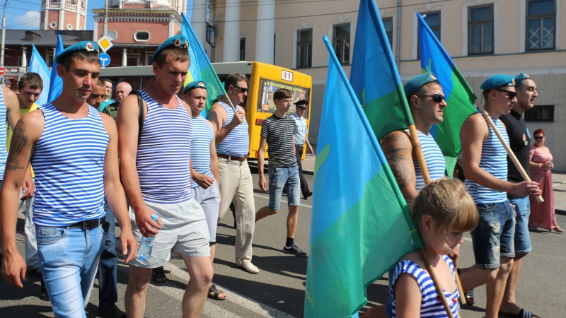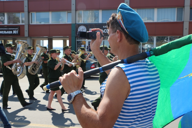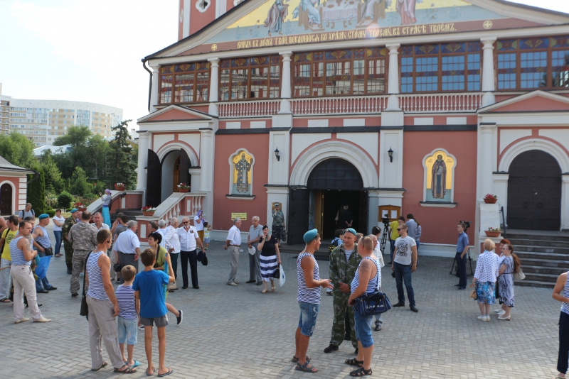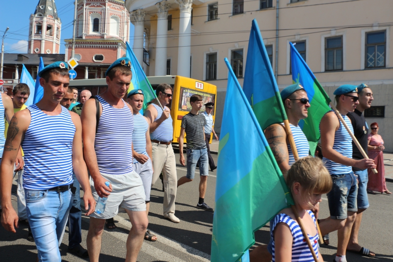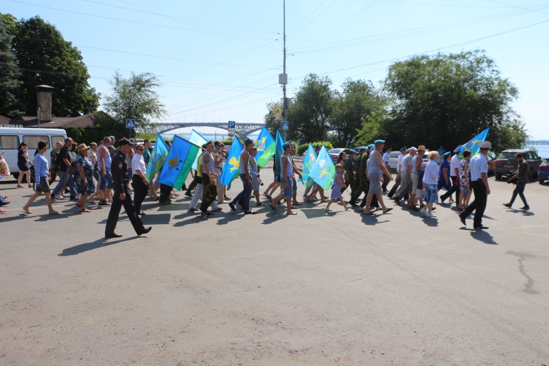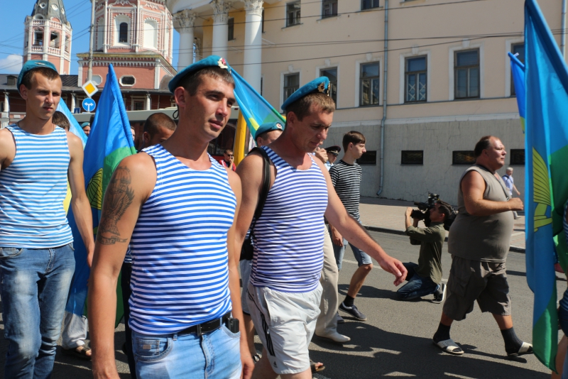 По окончанию церковной службы сотня десантников в тельняшках и голубых беретах выстроились в колонну и с флагами «За ВДВ» в руках в сопровождении сотрудников полиции направились к набережной Волги.