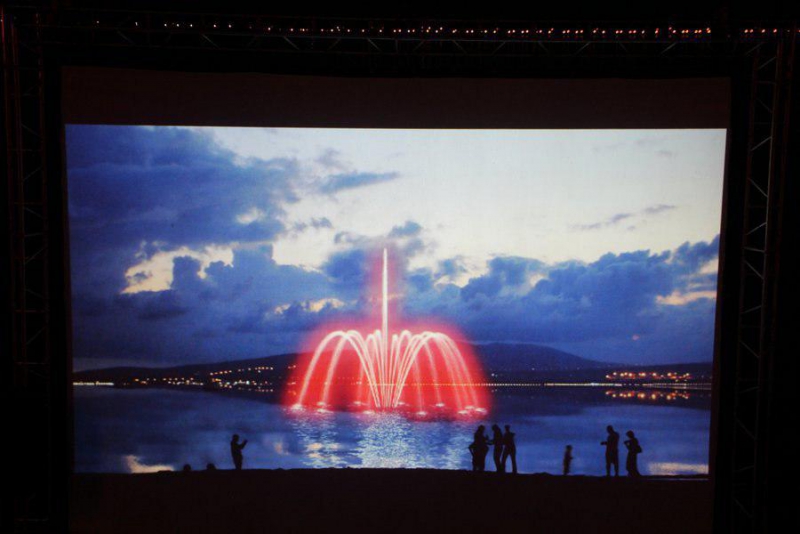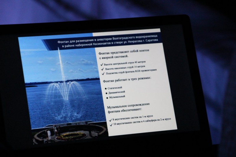 На будущий арт-объект посмотрел врио губернатора региона Валерий Радаев, глава города Валерий Сараев, городские и областные чиновники. На установленном большом экране показывали эскизы фонтана, а заместитель генерального директора компании ГК «ФонтанГрад» Виктор Бублик рассказывал о его характеристиках.