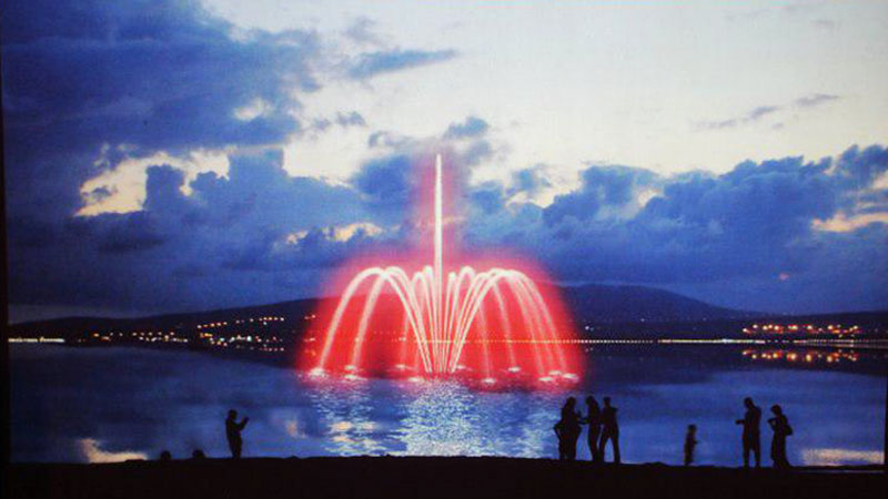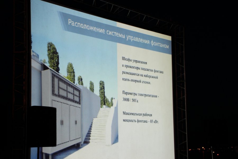 Так, фонтан установят на Волге в 40 метрах от набережной напротив спуска с улицы Некрасова. Сооружение будет представлять собой понтонный каркас с яркой системой. Высота центральной струи - 40 метров, наклонных - 14 метрах, подсветка струй осуществляется RGB-прожекторами. Фонтан будет работать в трех режимах: статичный, динамичный, музыкальный, для этого установят 8 акустических систем на 1-м ярусе и 10 акустических систем и 4 сабвуфера на 2 -м ярусе.