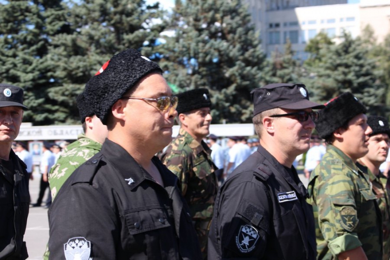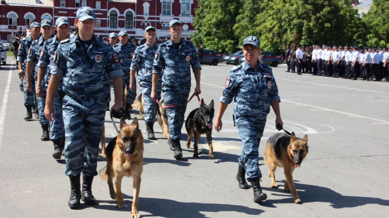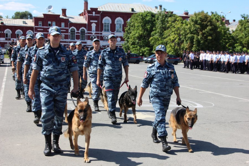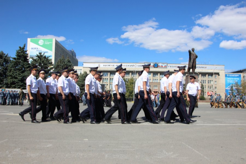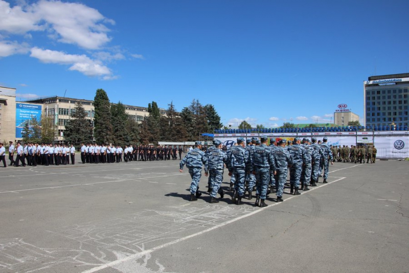 После этого колонны из полицейских, кинологов, сотрудников группы быстрого реагирования, ОМОНовцев, конного патруля и народных дружинников прошли по Театральной площади.