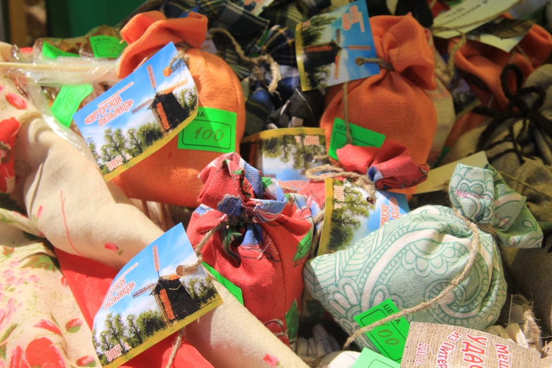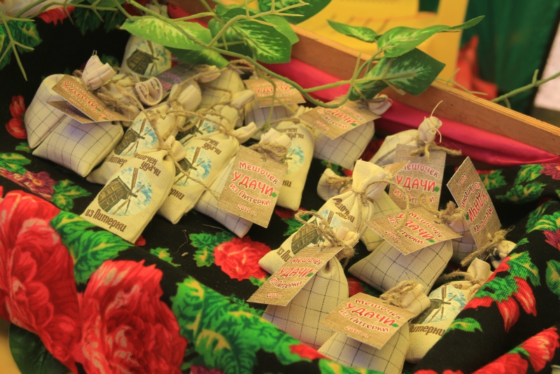 Очень хорошо раскупали сувениры, связанные с символикой этнокультурного центра – магниты и значки с изображением мельницы уходили на «ура». За «Мешочки удачи из Питерки», наполненные травами, просили по 100 рублей. Столько же стоил небольшой пакет муки, которую произвели на ветряной мельнице.