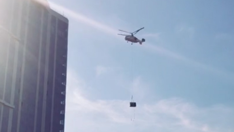 Вертолет доставляет непонятный груз на саратовский небоскреб. Видео