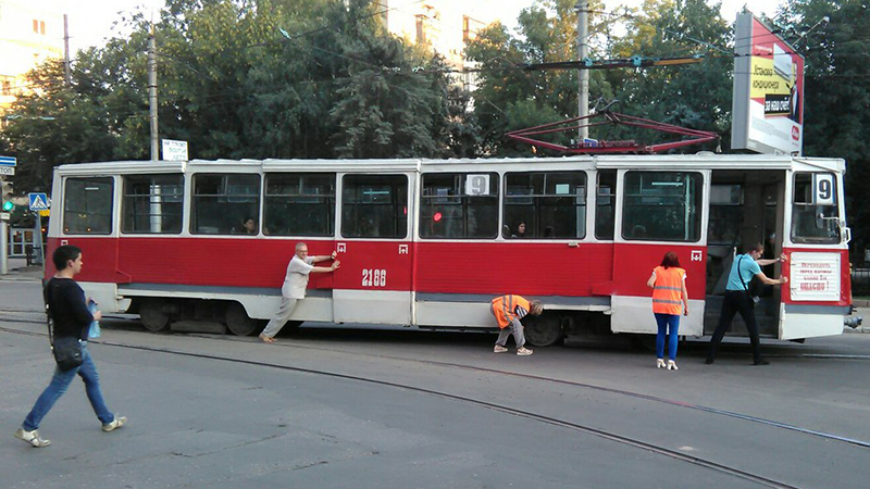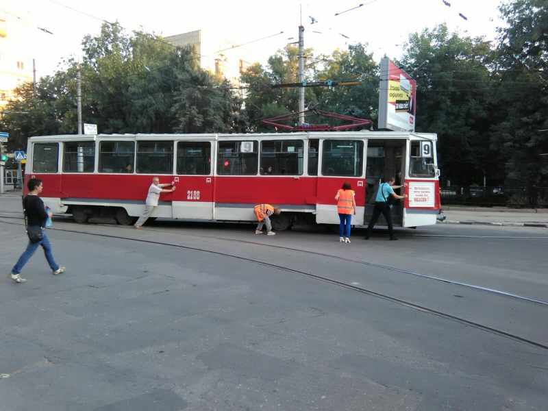 В центре Саратова пассажиры трамвая толкали свой вагон