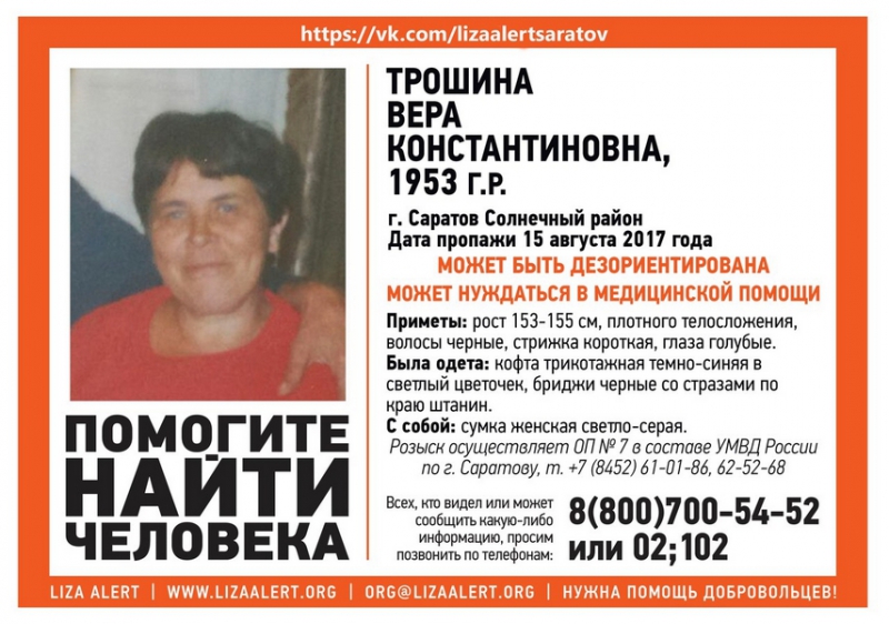 В Саратове найдена живой пропавшая 15 августа 64-летняя Вера Трошина. Об этом вчера вечером сообщили в поисковом сообществе «Лиза Алерт». Подробности обнаружения не раскрываются.