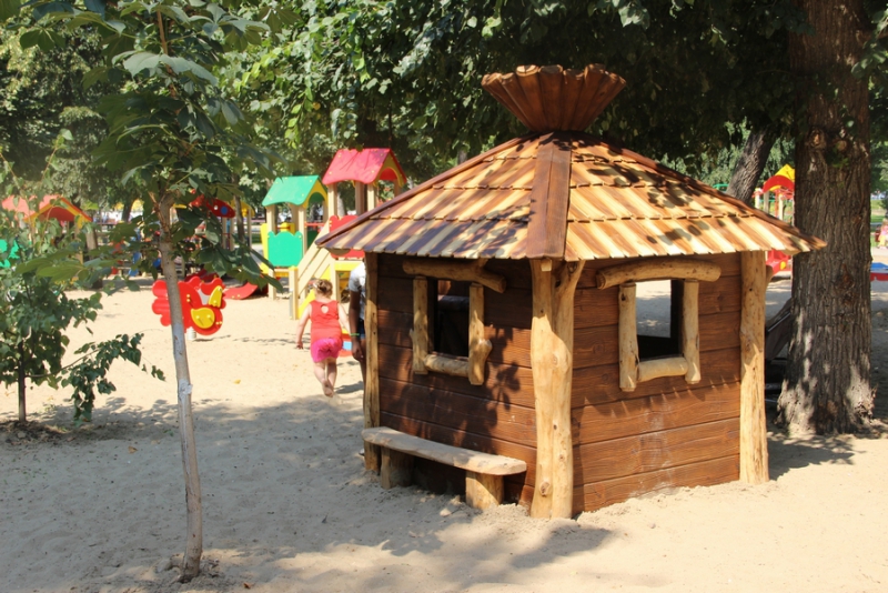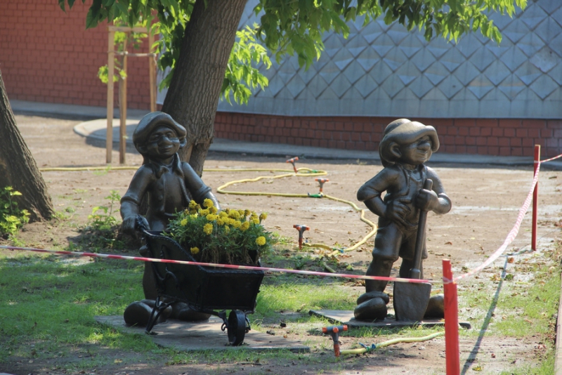 По аллеям размещены фигурки сказочных персонажей: гномов, гигантских рыб, домик Бабы Яги. Есть даже «рог изобилия».
