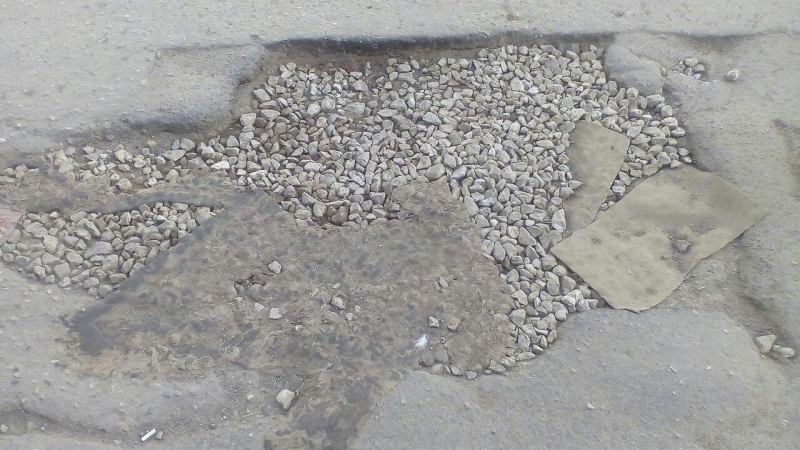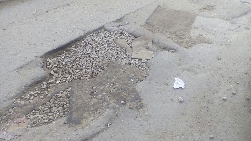 Из других экзотических материалов ремонта дорог можно вспомнить фигурки «белых котиков», которыми забросали ямы на улице Технической.