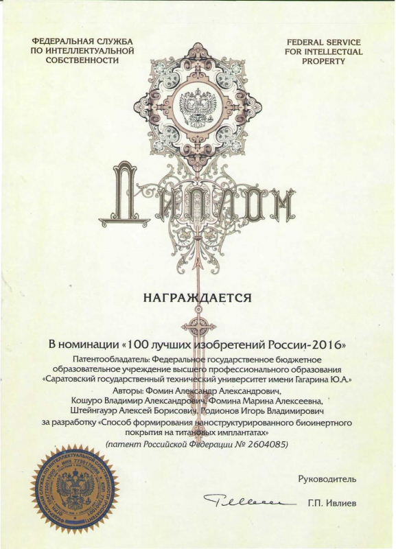 Изобретение ученых СГТУ имени Гагарина Ю.А., опорного вуза региона, вошло в рейтинг «100 лучших изобретений России – 2016». Ранее эта разработка сотрудников кафедры «Сварка и металлургия» Института электронной техники и машиностроения «Способ формирования наноструктурированного биоинертного покрытия на титановых имплантатах» также была включена в базу «Перспективных изобретений России».