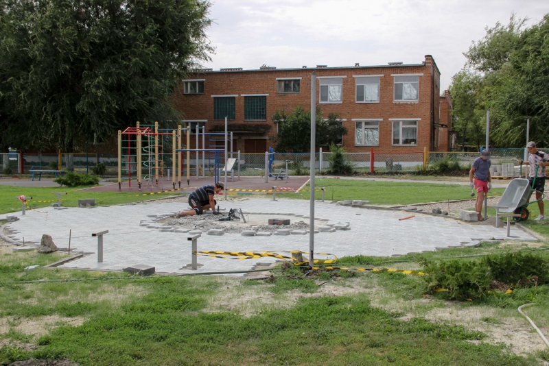 Вообще, центральная часть Татищева меняется на глазах. На улице Лапшова, у здания детской школы искусств установлены яркие, красочные, отвечающие всем самым современным и эстетическим, и функциональным требованиям детская и спортивная площадки (также по партийному проекту). Само здание ДШИ капитально отремонтировано: старые деревянные оконные блоки заменены на современные ПВХ блоки с тонированным остеклением; стены утеплены, отделаны декоративной штукатуркой и окрашены, цоколь здания облицован керамогранитной плиткой. Выполнены работы по замене стропильной системы и обрешетки кровли, шифер заменен на металлочерепицу. Завершены работы по переустройству пандуса, центрального и запасного входа. Здание ДШИ, ремонт которого близится к завершению, совсем скоро станет совсем другим – ярким, красочным, праздничным «дворцом» искусств для юных дарований Татищевского района. А лучи «радуги» с фасада здания перемещаются и на прилегающую территорию: здесь так же, как и в «Молодежном», появятся два фонтана, горизонтальные солнечные часы, цветочные клумбы, большое количество разнообразных хвойных деревьев и кустарников. Строятся пешеходные дорожки и зелёные зоны, зоны отдыха, установлено ажурное металлическое ограждение. Пробурена водяная скважина для полива, залита бетоном опорная стенка между двумя уровнями площадок сквера, установлены опоры под светодиодные светильники и опоры для декоративного освещения, ведётся монтаж видеонаблюдения.