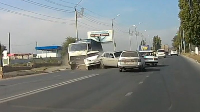 Как видно на записи, грузовик «МАЗ» ехал по левой полосе, а потом он решил свернуть на правую. Одновременно с ним движение начала «Тойота», пытаясь обогнать «Волгу». В итоге грузовая машина ударила иномарку в заднюю часть, и произошло столкновение с «Волгой» и двумя встречными «ВАЗами».