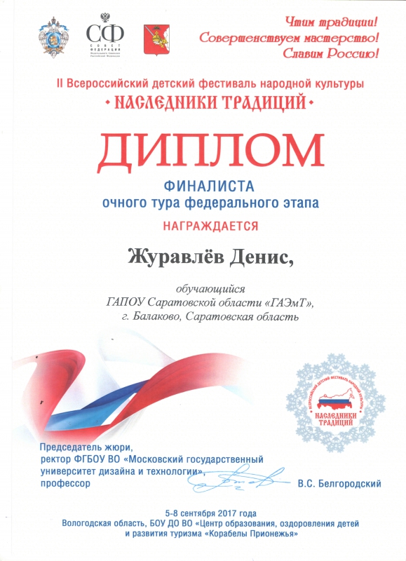 По итогам конкурса Александр Белоглазов и Денис Журавлев получили дипломы финалистов Фестиваля «Наследники традиций».