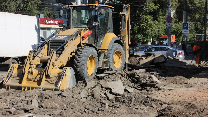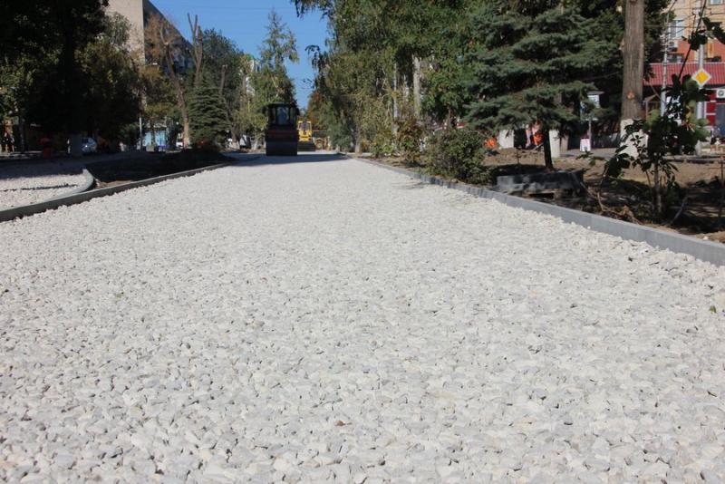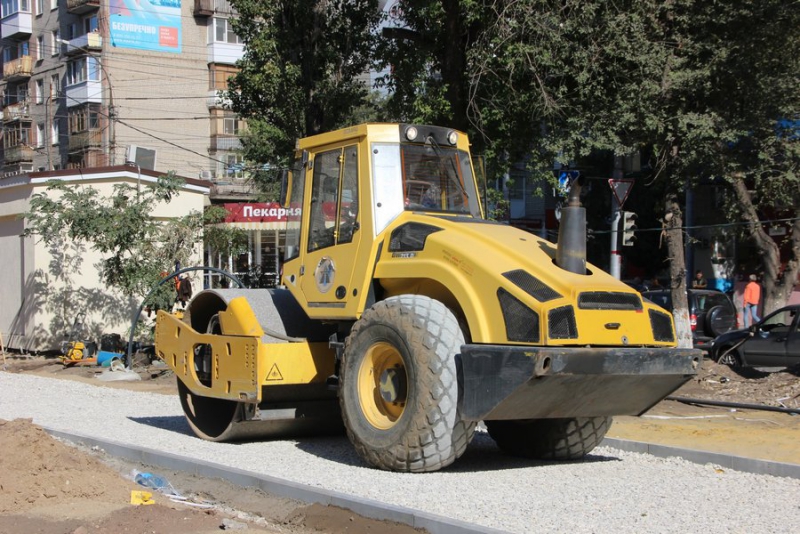 От улицы Мичурина до Рабочей активно работает многочисленная техника. Бобкэты выравнивают площадки земли, возят песок. Два катка утрамбовывают щебень. Гусеничный трактор с ковшом выкорчевывает пни и свозит их в одно место.