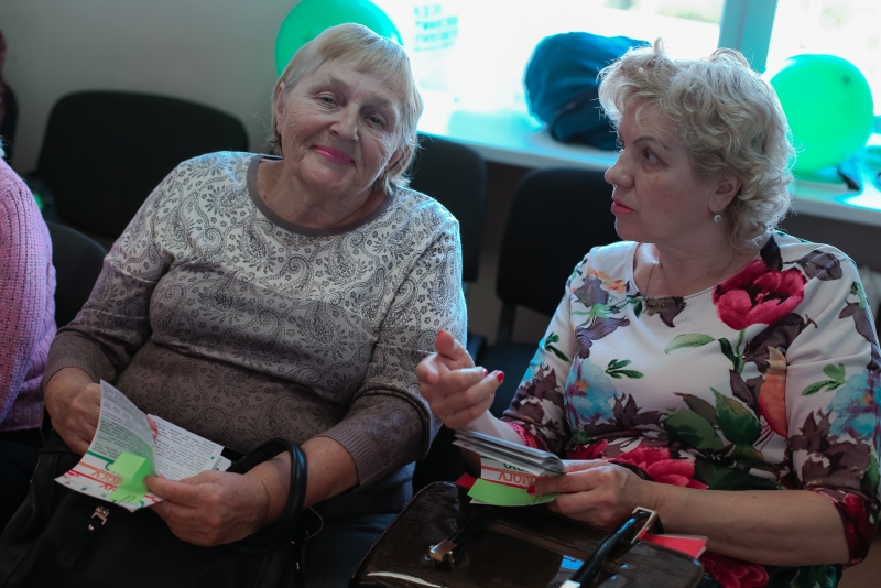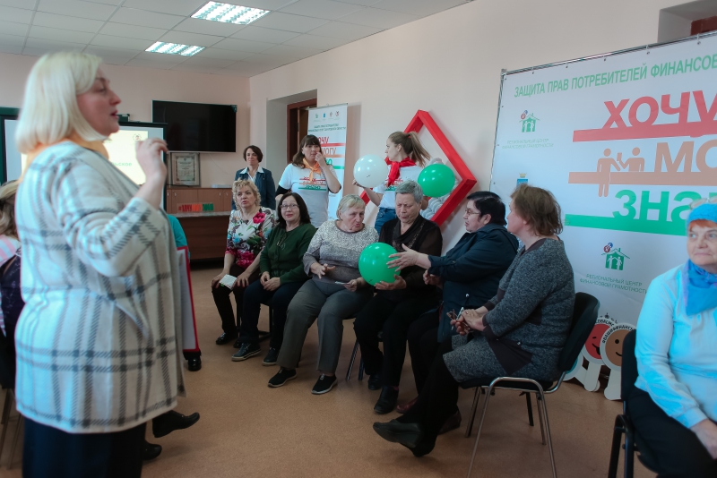 Затем представители старшего поколения, поделившись на команды, приняли участие в поэтическом конкурсе «Поэмы о финансах». Каждая команда, выбрав шар с находящейся внутри него карточкой с заданием, составляла четверостишие о финансовой услуге. Наиболее активные участники получили памятные призы и сувениры, а все желающие смогли сделать фотографии на память с символикой Проекта.