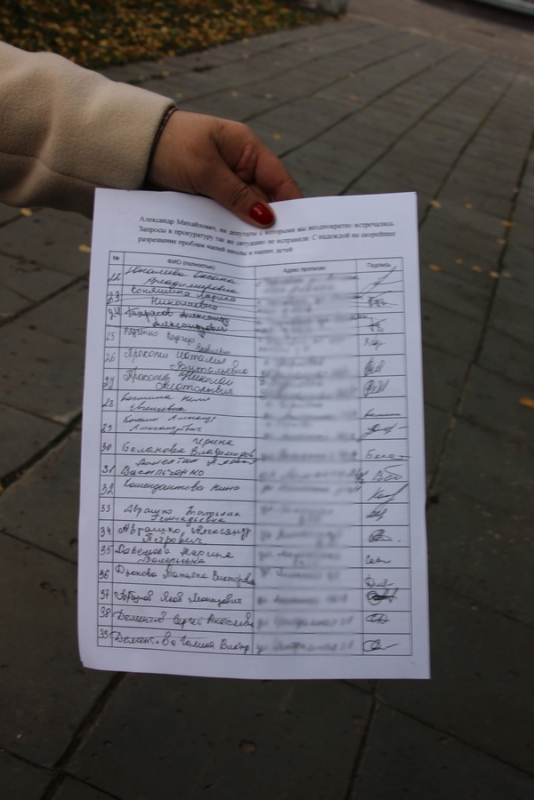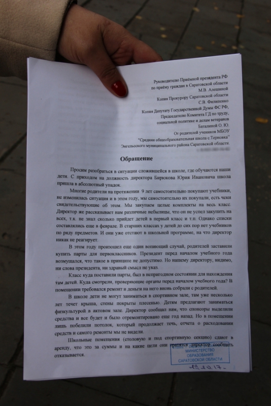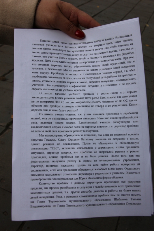 Терновцы несколько раз поднимали эту тему. Писали письма директору, депутатам, но ответа ни от кого не получили, поэтому сегодня они решили обратиться в приемные президента РФ, партии «Единая Россия», прокуратуры и регионального министерства образования. Везде их письма зарегистрировали и велели ждать ответа. Сейчас собрано 46 подписей, но раньше их было больше, некоторые родители попросили вычеркнуть их из списков, сообщила Оксана.