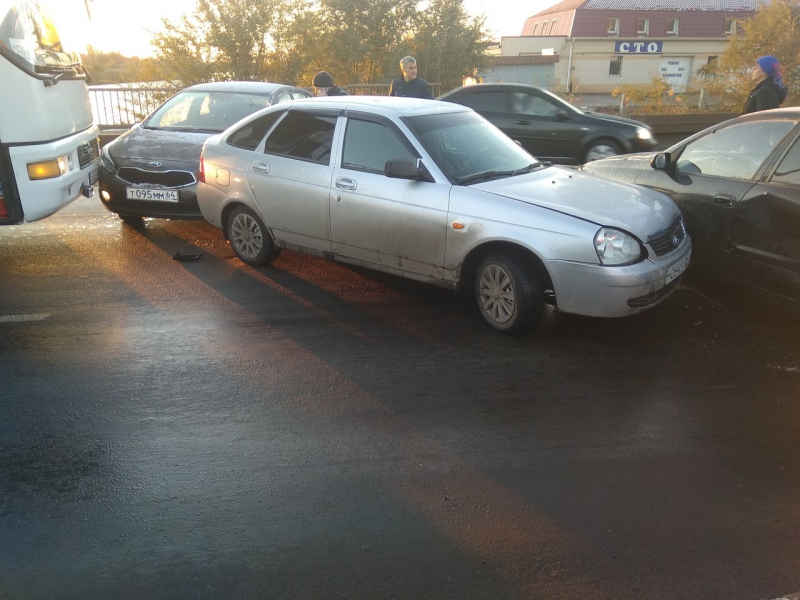 На Мировском мосту столкнулись автобус и 3 легковых автомобиля. Неподалеку произошла авария с участием еще трех легковых машин.