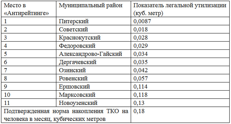 Экологический антирейтинг подсчитан на основании данных по объемам ТКО, поступивших с начала 2017 года на районные МПС, в пересчете на количество жителей. Безусловным лидером экологического антирейтинга является Питерский район. Так, жители рабочего поселка Питерка легально утилизируют меньше всего ТКО – 0,0087 кубического метра на одного жителя в месяц. Это меньше обычного бытового ведра объемом 10 литров.