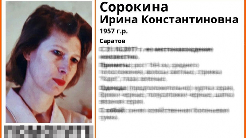 Ранее поступала информация, что женщина перестала выходить на связь с 21 октября. О саратовчанке было известно, что у нее, кроме фамилии Сорокина, были еще две – Кондратьева и Фомина.