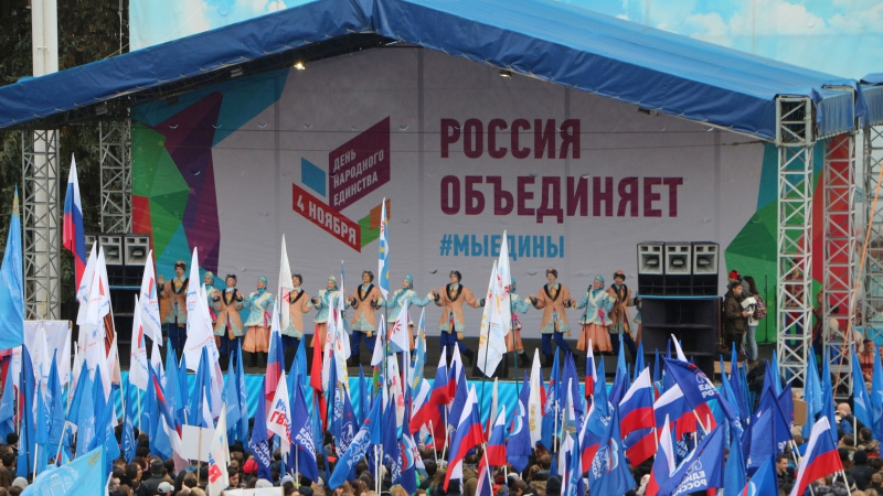 Для горожан со сцены выступают народные танцевальные и вокальные коллективы, исполняющие песни о России. Участники пришли с флагами страны и своих организаций, некоторые держат в руках плакаты с надписями «Не допустим новой смуты», «Строить, делать, созидать. Для тебя, Россия-мать», «Россия сильна единым народом» и др. Само мероприятие проходит под лозунгом «Россия объединяет».