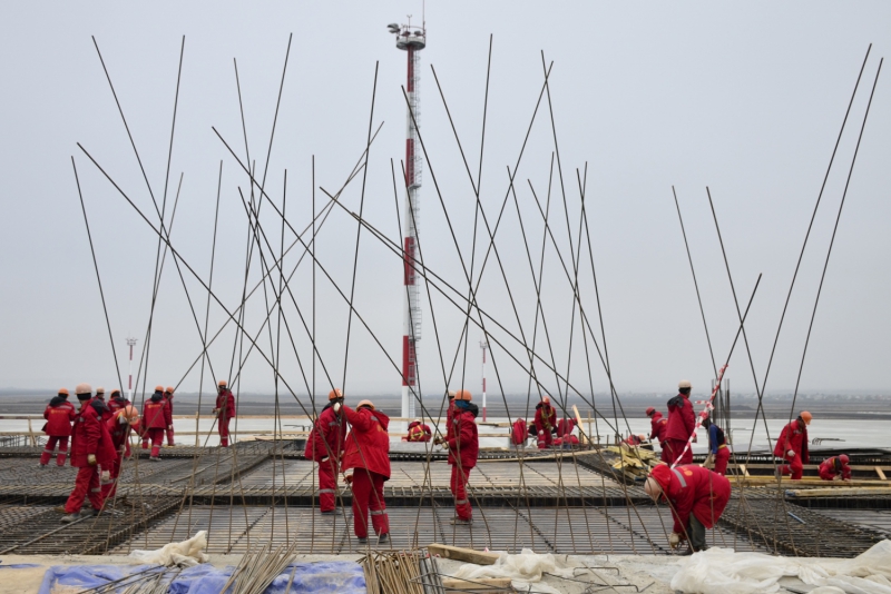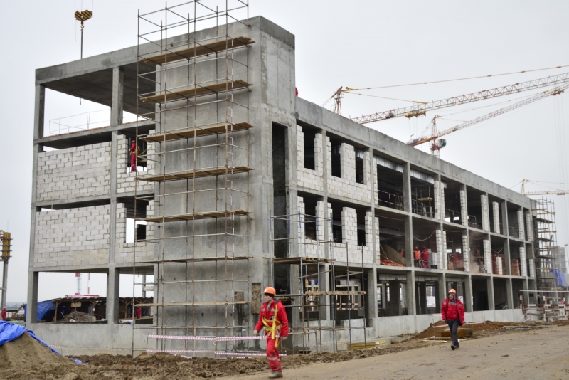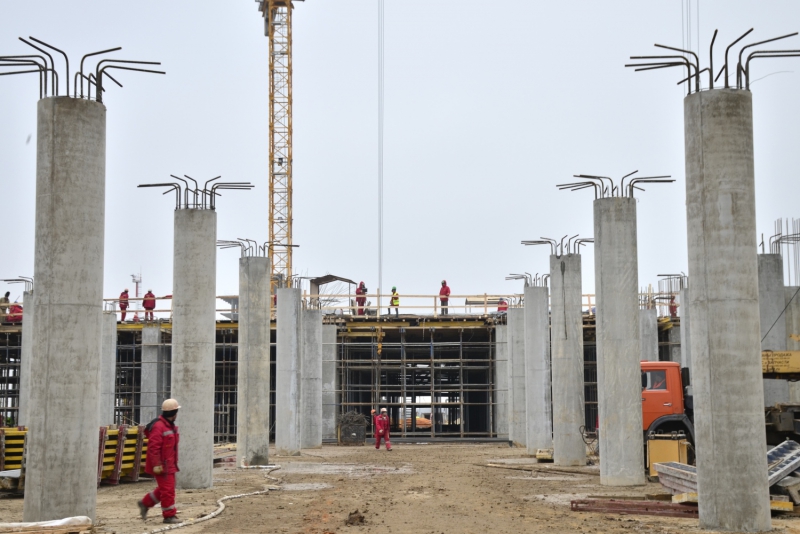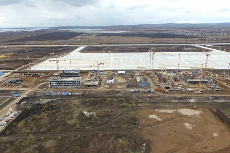 К строительству пассажирского терминала, а также других зданий и сооружений инвестиционной части, привлечено 580 строителей и 35 единиц техники, включая пять башенных кранов.