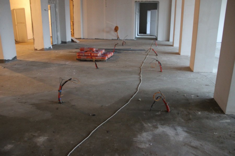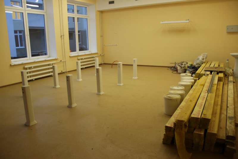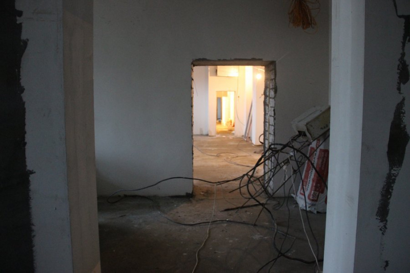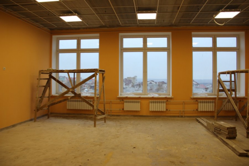 Наполовину обустроена кровля здания. Внутри оштукатурены все стены, они также почти полностью зашпатлеваны, на 50% выполнена их покраска, полы готовы на 98%, уложено 50% линолеума. Фасад здания утеплили на 75%. На 30% обустроены футбольные трибуны. Каждый день здесь работают около 58 рабочих и порядка 11 единиц техники.
