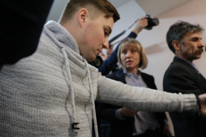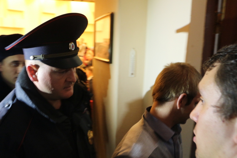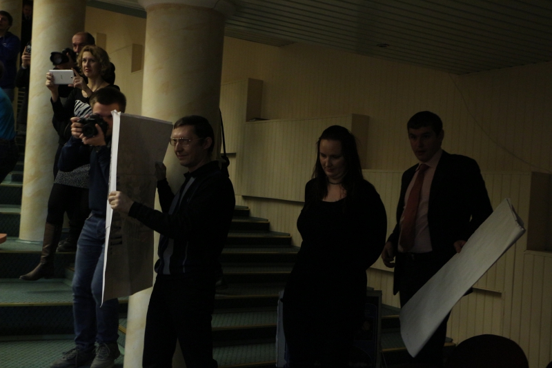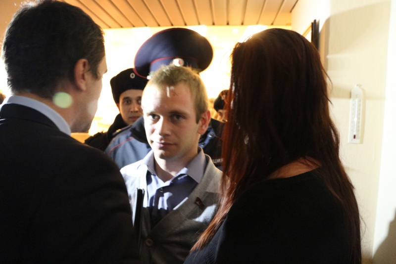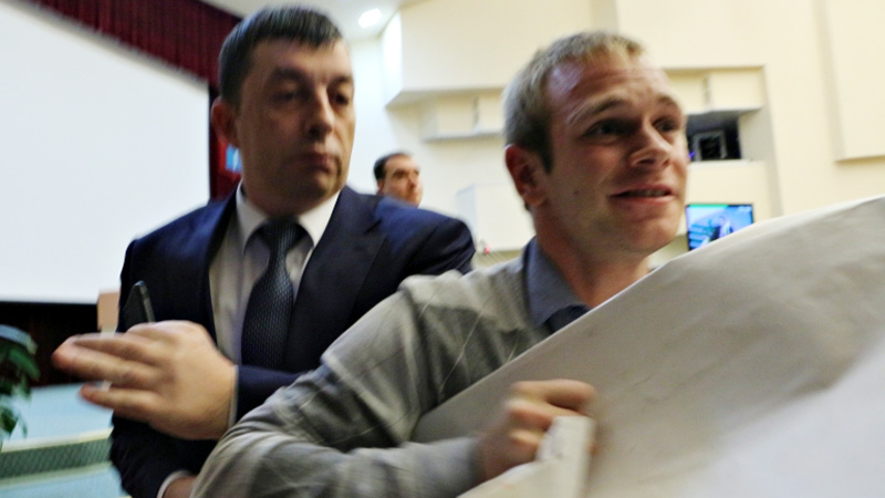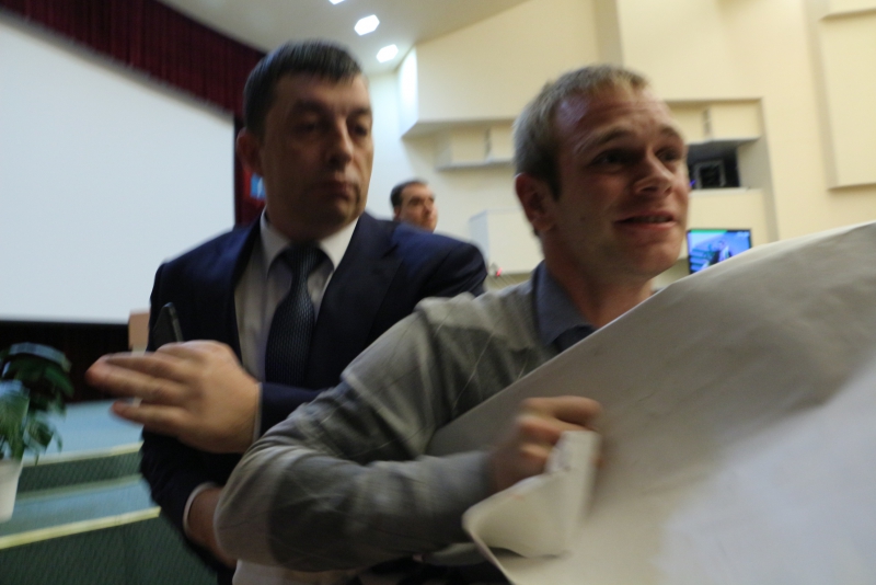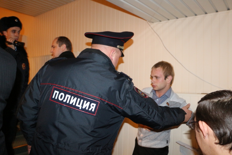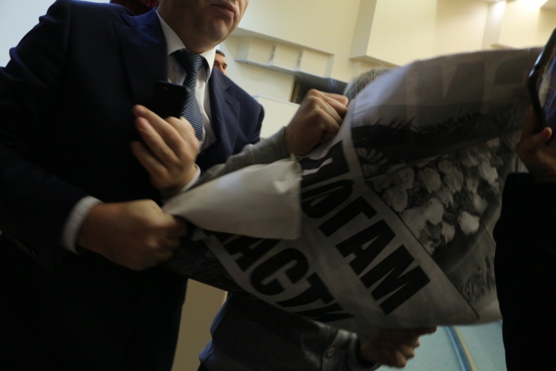 Против такой акции выступил председатель областной думы Иван Кузьмин. Он попросил активистов свернуть плакаты и уйти от трибуны. Но они этого не сделали. В эту минуту в зал вошли сотрудники полиции, чтобы вывести протестующих из помещения. Им помогал работник аппарата Максим Федукин, который попытался отнять плакат у молодого человека, но тот вырывался, что привело к стычке.