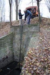 Администрация района сегодня занята выяснением, к кому относится переливная труба - Саратовской ГЭС или Балаковскому району гидротехнических сооружений и судоходства. Пока идут разбирательства, к чистке переливной трубы приступило муниципальное коммунальное предприятие - «Балавтодор», в автопарке которого имеется несколько машин для прочистки ливневой канализации. Особенности технологического процесса рассказал мастер МУП «Балавтодор» Андрей Вдовухин.