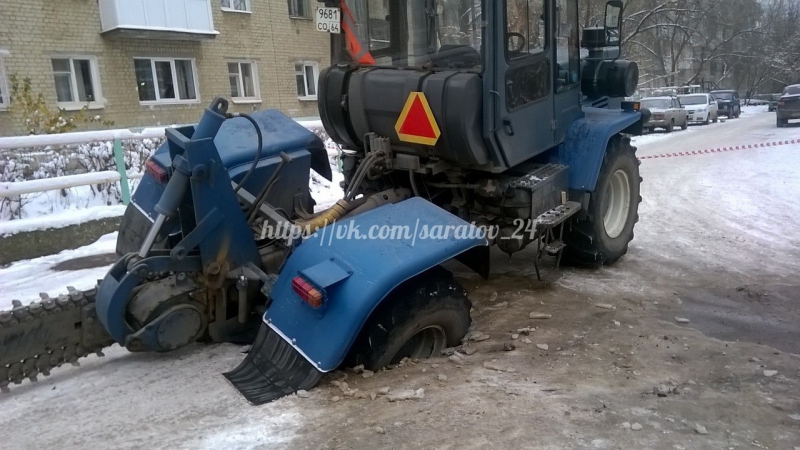 Сегодня в Ленинском районе Саратова трактор, прибывший для ремонта коммуникаций на место аварии, провалился в яму. Информацию об этом разместили пользователи страницы «Саратов онлайн» соцсети «ВКонтакте».