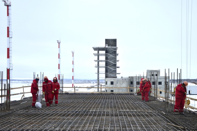 Монолитный каркас пассажирского терминала нового аэропорта возведен на 40%. Строители выполнили устройство колонн первого этажа, завершают заливку плиты перекрытия между первым и вторым этажом и приступили к армированию колонн второго этажа здания.