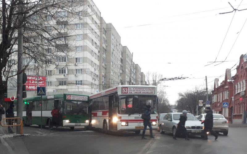 Сегодня в центре Саратова произошло столкновение двух автобусов. ДТП случилось на перекрестке улиц Московской и Чапаева. Информация об этом появилась в социальных сетях.