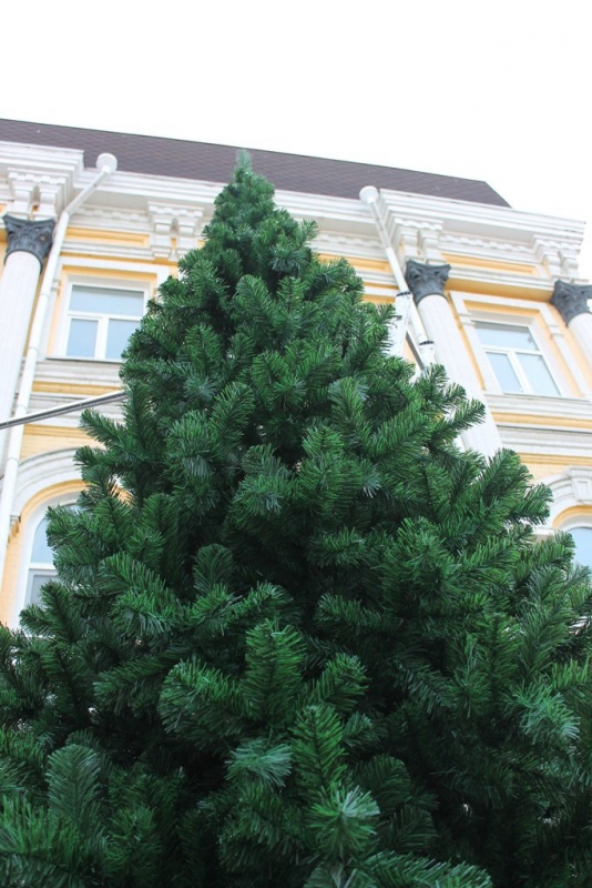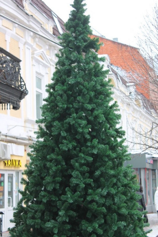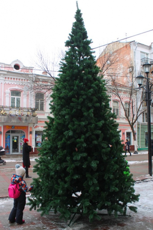 Ель расположилась перед одним из торговых комплексов на участке между Вольской и Горького. Вскоре дерево планируют украсить гирляндами и игрушками.