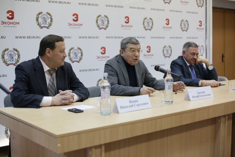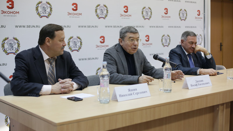 Иосиф Дискин обратился к аудитории со словами приветствия и подчеркнул, что рад встретиться с частью большого семейства Плехановцев, коим ему также довелось побывать и из которого вышли многие известные ученые и государственные деятели.