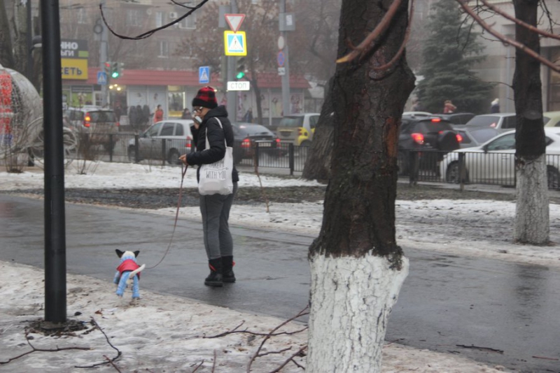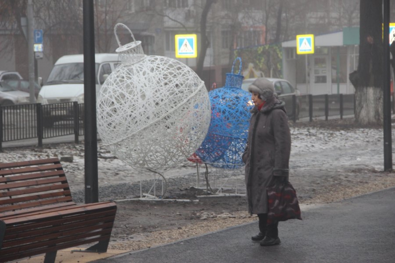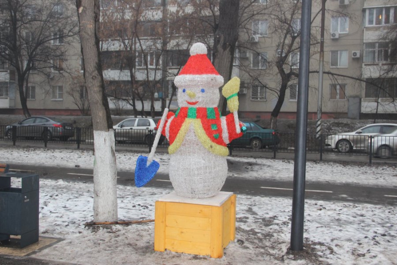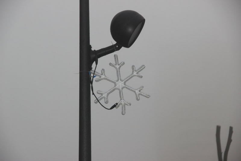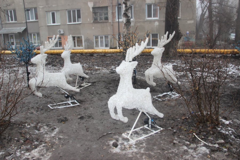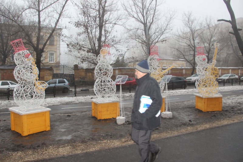 На фонари вешают блестящие снежинки, протягивают тросы для мишуры. В сквере появились новые сказочные персонажи - это второй Дед Мороз (он установлен неподалеку от огороженной площадки для собак), снеговик с лопатой и метлой, неподалеку от входа в сквер 1905 года поставили четырех оленей.
