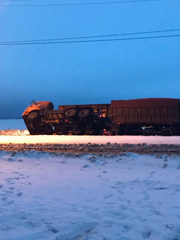 Выяснилось, что в качестве груза там были семена подсолнечника (часть, около 250 кг, рассыпалась, остальное держалось тентом). Возле машины останавливались дальнобойщики, но они ничем особо помочь не могли: как минимум до ночи он оставался там. Ситуацию усугубляет то, что из-за ДТП оказалась погнута рама.