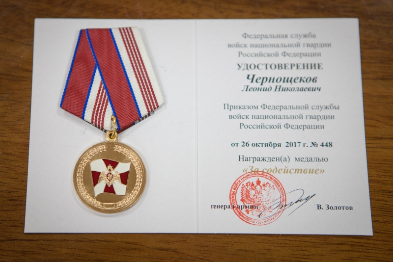 За оказание содействия в выполнении задач и осуществлении полномочий, возложенных на войска национальной гвардии Российской Федерации, генеральному директору ООО «Газпром трансгаз Саратов», депутату Саратовской областной думы Леониду Чернощекову вручена медаль «За содействие».
