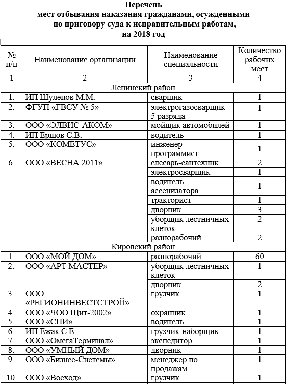 Как следует из постановления, в качестве мест отбывания наказания будут предложены такие профессии, как разнорабочий, дворник, сварщик, слесарь, уборщик, грузчик, охранник, мойщик, водитель ассенизатора и т.д. Среди прочего имеются вакансии инженера-программиста, менеджер по продажам, руководитель отдела продаж, водитель автобуса, ветеринарный врач, специалист по работе с населением и др.