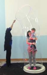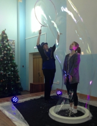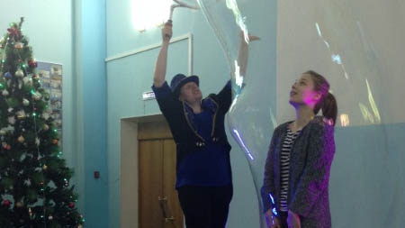 На праздник, в актовый зал больницы, пришли дети вместе со своими родителями. В зале была невероятная атмосфера добра и радости. Фокусник надувал разноцветные мыльные пузыри разных размеров и форм и ребята с завораживающим восторгом смотрели на эту чарующую магию. Каждый ребенок и взрослый получил возможность стать частью представления, прикоснуться к волшебству, половить маленькие пузырики и попасть в огромный мыльный пузырь.