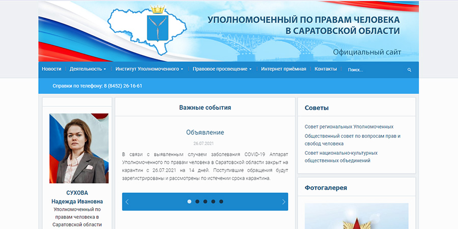 С сегодняшнего дня, 26 июля, аппарат уполномоченного по правам человека в Саратовской области Надежды Суховой закрыт на карантин. В аппарате уточнили, что это связано «с выявленным случаем заболевания COVID-19».