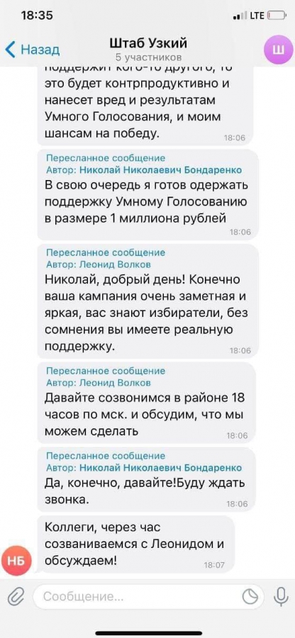 Кроме того, сегодня была вскрыта предполагаемая переписка Николая Бондаренко с начальником штаба «Фонда борьбы с коррупцией» (признана в России экстремистской организацией и запрещена на территории страны) Леонидом Волковым (скрины этих переговоров обнародованы в телеграм-каналах).