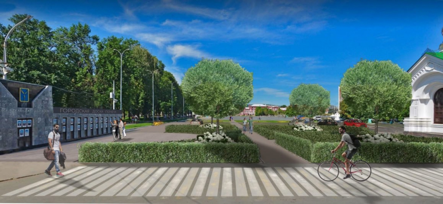 Комитет по архитектуре предложил концепцию этого участка, которая предусматривает озеленение и зонирование, чтобы убрать часть автомобилей от подножия часовни и городской доски почета. Павел Сурков успокоил автомобилистов, сказав, что транспорт в дальнейшем может размещаться на бесплатной парковке, которая строится на улице Зарубина, 5А.