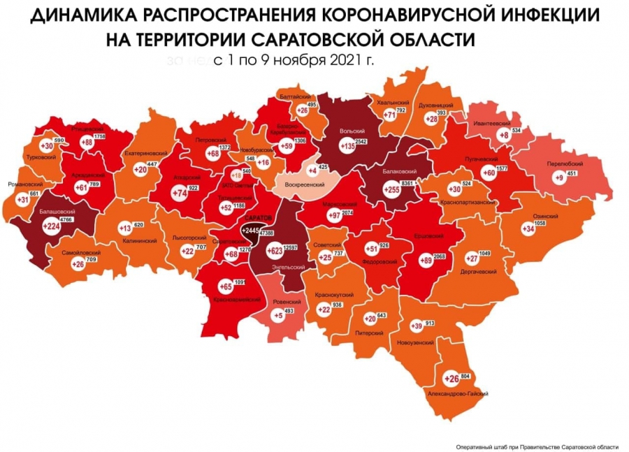 В областном центре коронавирус нашли за этот период у 2 445 человек, в Энгельсском районе – у 623, в Балаковском – у 255, Балашовском – 224, Вольском – 135 жителей.