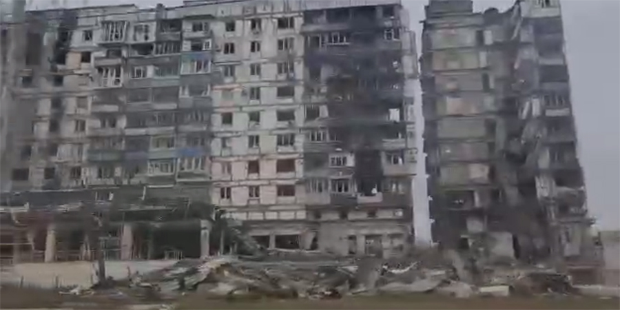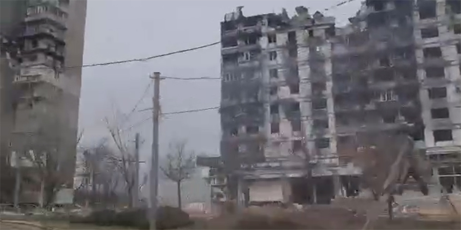 На кадрах видео можно заметить полуразрушенные обгоревшие многоэтажные здания. Жилые дома, где когда-то жили люди, уничтожены силами неприятеля. Из высоток буквально вырваны куски стен, и на этих местах чернеют следы от выпущенных снарядов.