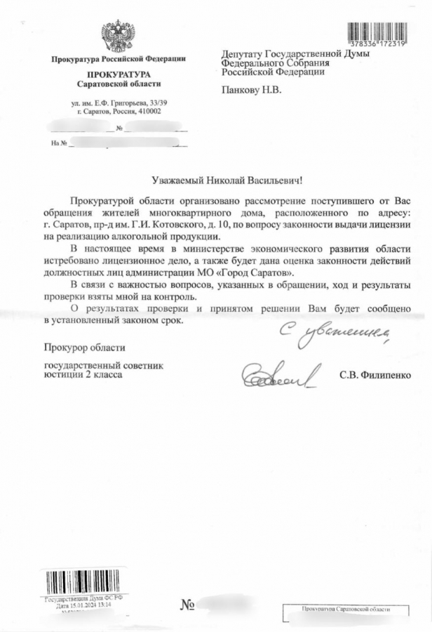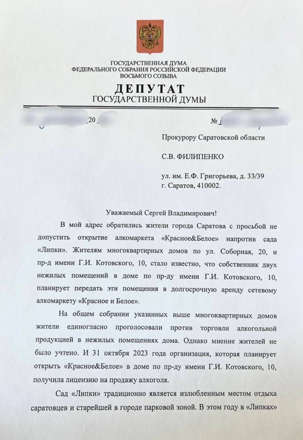 Как сообщил телеграм-канал «Помощники Панкова», депутат направил запрос в областную прокуратуру, понимая последствия работы алкомаркета рядом с Липками и культурно-образовательными учреждениями. Прокуратура области истребовала лицензионное дело и настояла на его дополнительной проверке. В результате вскоре саратовцы получили ответ правительства области, что объект исключен из выданной ранее лицензии.