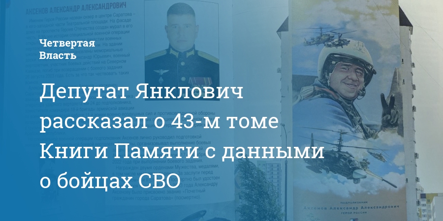 В Саратовской области завершают подготовку к изданию 43-го тома региональной Книги Памяти, в которую могут добавить новый раздел и данные о семьях бойцов СВО. Данную тему сегодня осветил на совещании в областной думе председатель комитета по делам ветеранов, Герой России Александр Янклович («Единая Россия»).