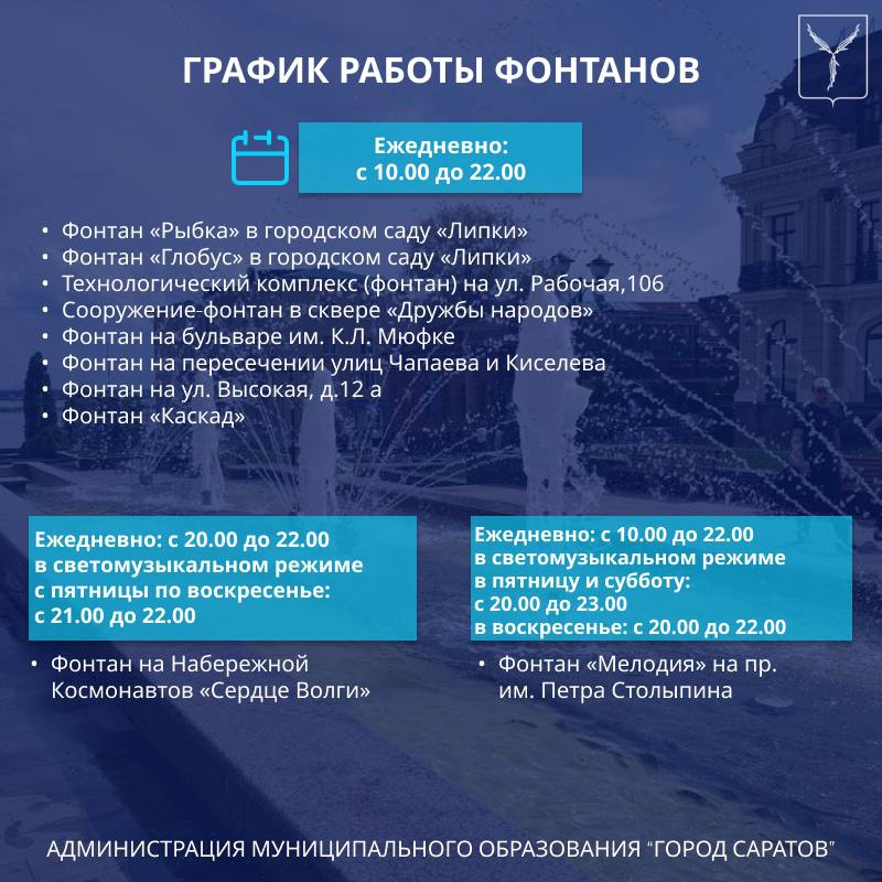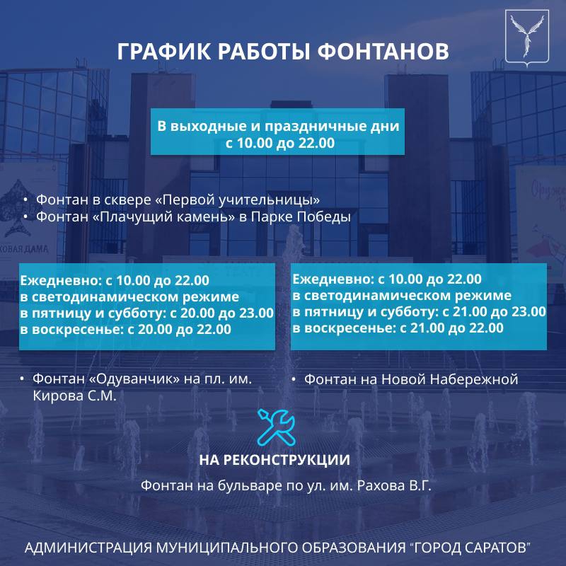 На территории Саратова начали функционировать 14 фонтанов, еще один пока находится на реконструкции. Городская администрация опубликовала график их работы.