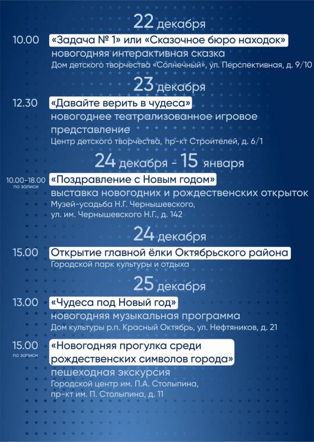 В период с 22 декабря 2022 года по 8 января 2023 года для жителей и гостей города запланированы творческие и спортивные программы.