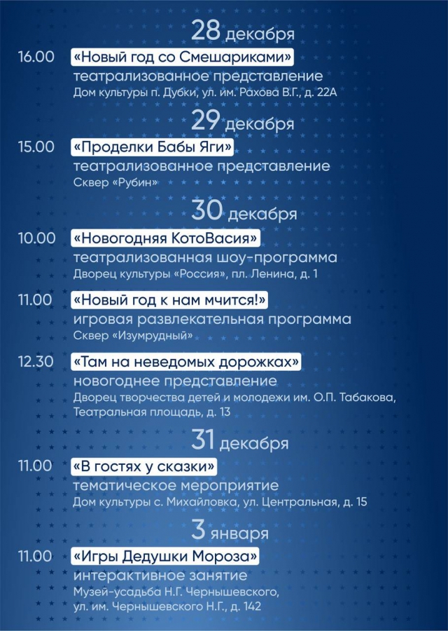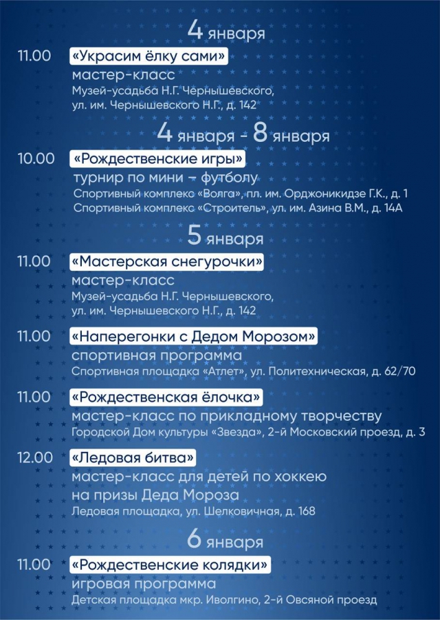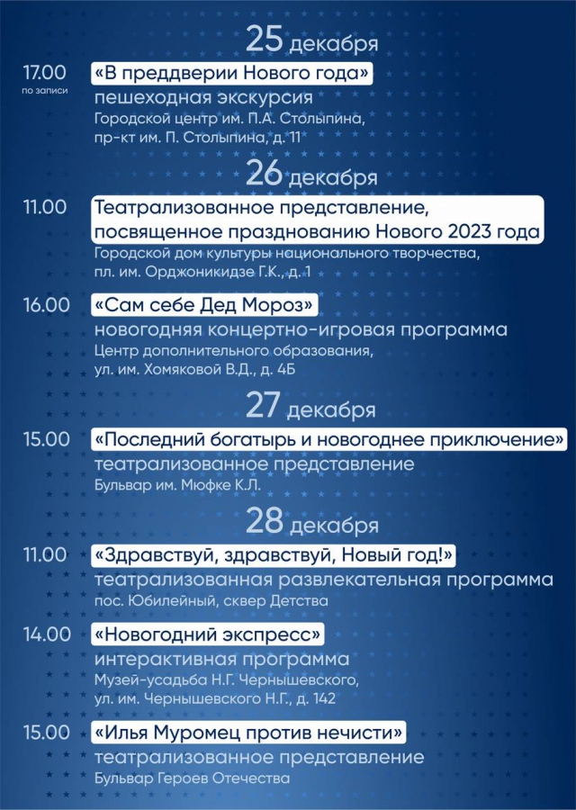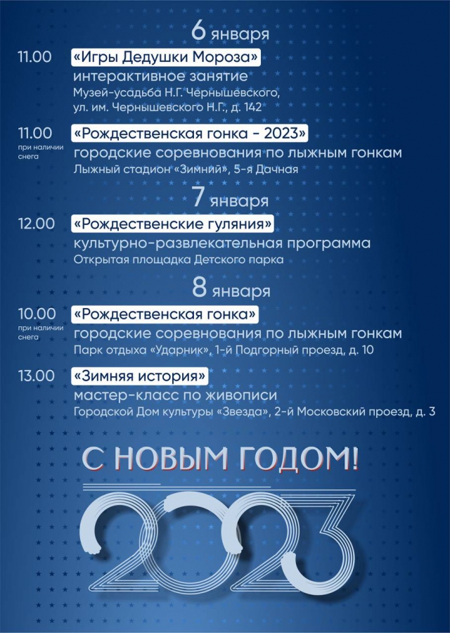 На Театральной площади 25-31 декабря и 2-8 января с 15.00 до 19.00 состоятся интерактивные анимационные программы в Доме Деда Мороза. В декабре по записи можно посетить две пешеходные экскурсии «Новогодняя прогулка среди рождественских символов города» и «В преддверии Нового года». В городе пройдут турниры «Рождественские игры» по мини-футболу с 4 по 8 января, а также 7 и 8 января при наличии снега проведут городские соревнования по лыжным гонкам «Рождественская гонка – 2023». Помимо этого, на открытой площади Детского парка состоится культурно-развлекательная программа «Рождественские гуляния».