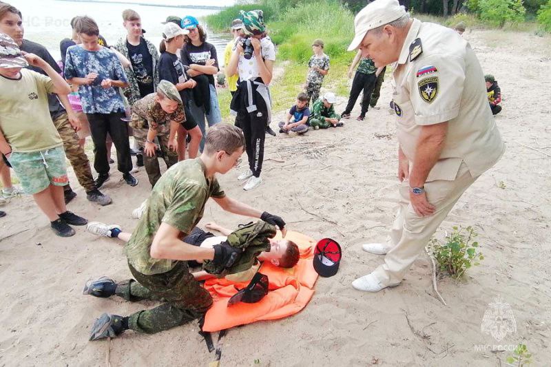 После ознакомления с пожарной техникой и аварийно-спасательным оборудованием, ребята преодолевали веревочные этапы, используя туристско-альпинистское снаряжение, а также отрабатывали элементы спасения людей на водных объектах. Разбившись на команды, используя карту местности, подростки организовывали поиск пострадавших, их эвакуацию с помощью подручных средств. Каждый из них научился вязать носилки с помощью веревки и двух жердей и оказывать первую помощь «условно» пострадавшему.